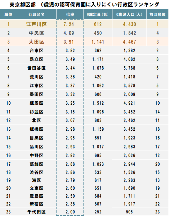 台東区や大田区も上位傾向が続いており、未だ保活は高倍率の状態が継続しています。一方、世田谷区は0歳児人口が23区で最も多いものの、認可相当0歳児定員も多く、倍率は中位にとどまっています。
