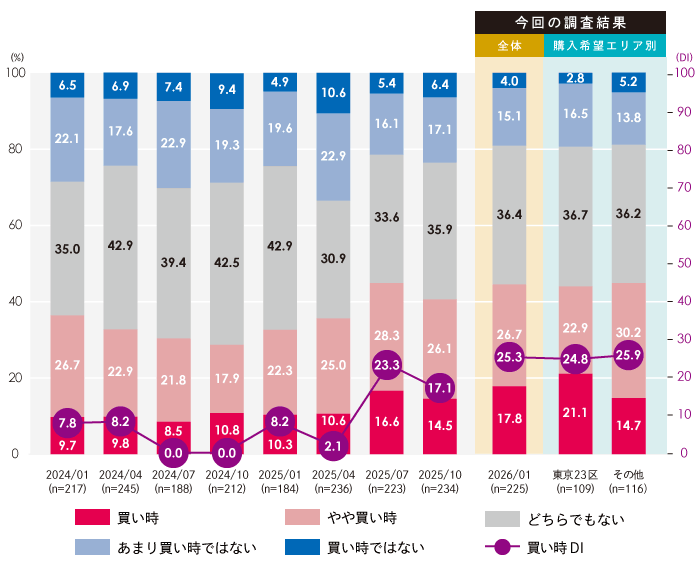 こうした状況下で、「買い時」と回答した層(「買い時」+「やや買い時」の合計)は44.4%に達しました。買い時DI(※)も25.3ポイントとなり、2015年以来初めて25ポイントを超えています。